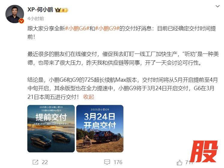 小鹏汽车:小鹏G6和小鹏G9目前已经确定交付时间提前小鹏汽车:小鹏G6和小鹏G9目前已经确定交付时间提前